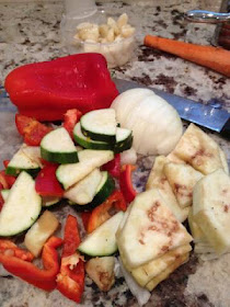 | Cut up zucchini, eggplant, red pepper, tomatoes , garlic and onions |